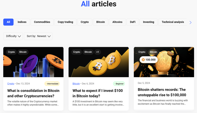 PrimeXBT’s educational articles are well-structured and clearly written, covering a range of topics from beginner to advanced levels across various trading strategies. The content is easy to follow and effectively explains key concepts without unnecessary jargon, making it particularly useful for newer traders. The library excels in crypto-focused education, which aligns closely with the platform’s broader offerings.