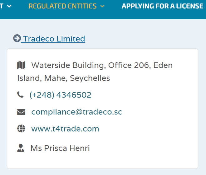 T4Trade operates a single entity – Tradeco Limited – which is licensed and regulated in Seychelles by the Financial Services Authority (FSA). It guarantees the segregation of client funds and negative balance protection. I also found the broker to be particularly transparent.