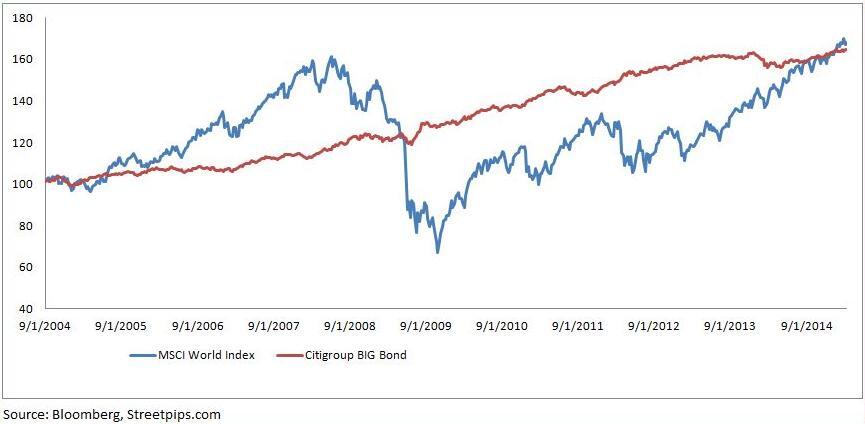 For example, Chart 1 below shows the normalised returns of Global Equities, as represented by MSCI World Index, versus Global Bonds, as represented by Citigroup Broad Investment Grade Bonds Index.