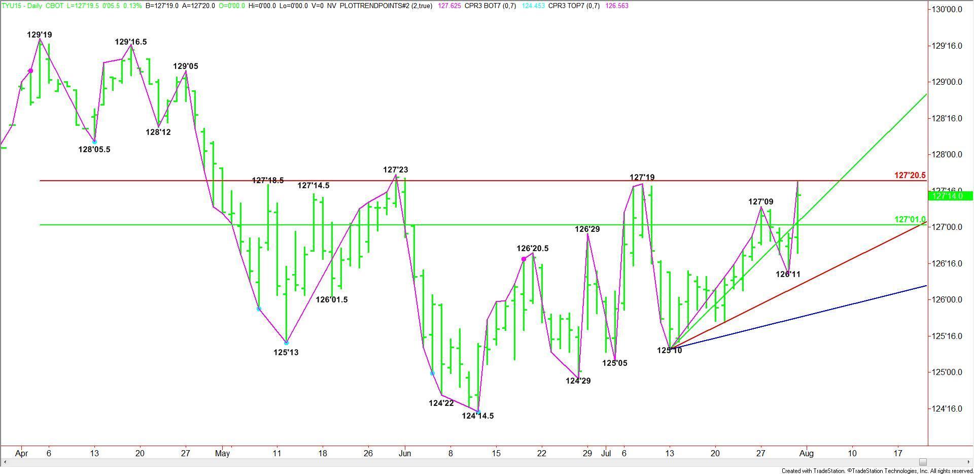 September 10-Year U.S. Treasury Notes surged to the upside on Friday. The move took out the previous main top at 127’09, reaffirming the uptrend on the daily swing chart. The new main bottom is 126’11.