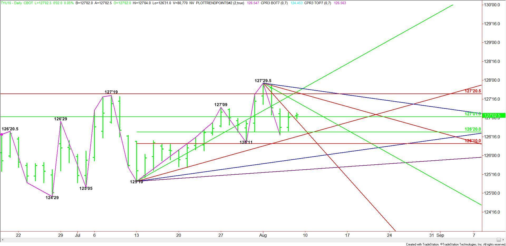 During the pre-market session, T-Notes are trading on the strong side of a downtrending angle at 126’29.5 and a major 50% level at 127’01. This is giving the market an early upside bias.