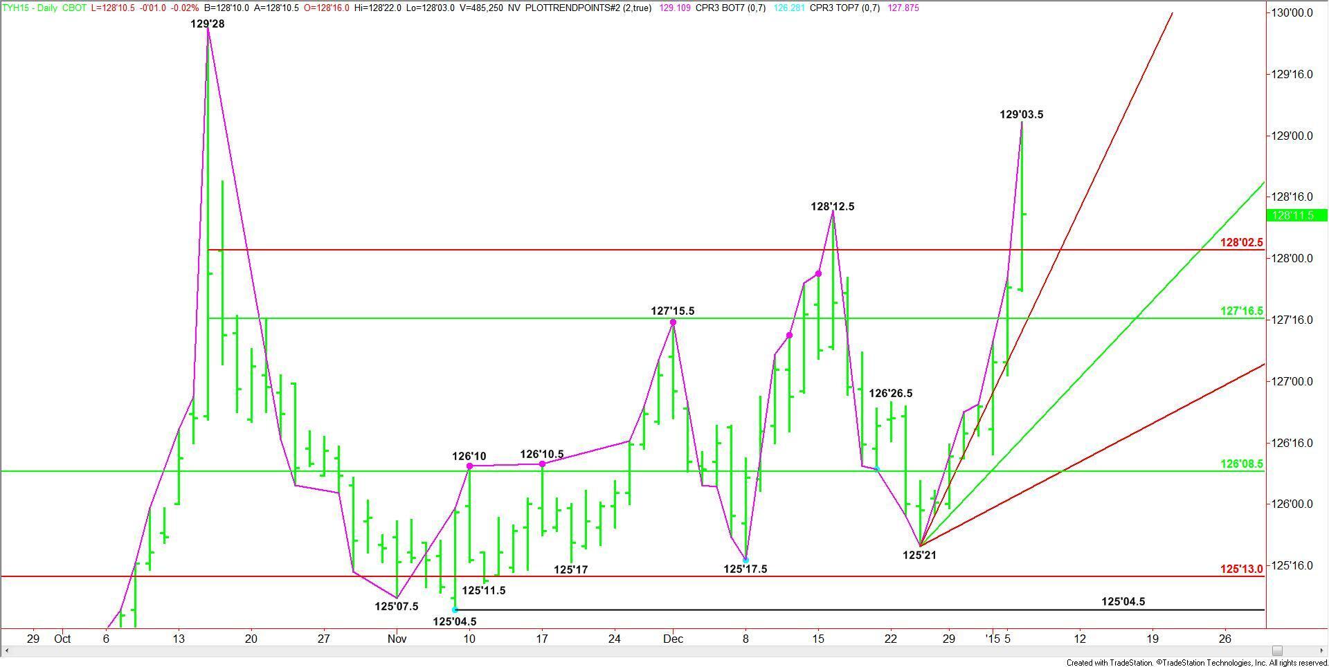Upside momentum continued early in the session on Tuesday, driving the March 10-Year U.S. Treasury Notes to their highest level since October 15. Sellers came in heavy after the market reached 129’03.5 as the position-squaring began ahead of today’s release of the latest Fed minutes and Friday’s very important U.S. Non-Farm Payrolls report.