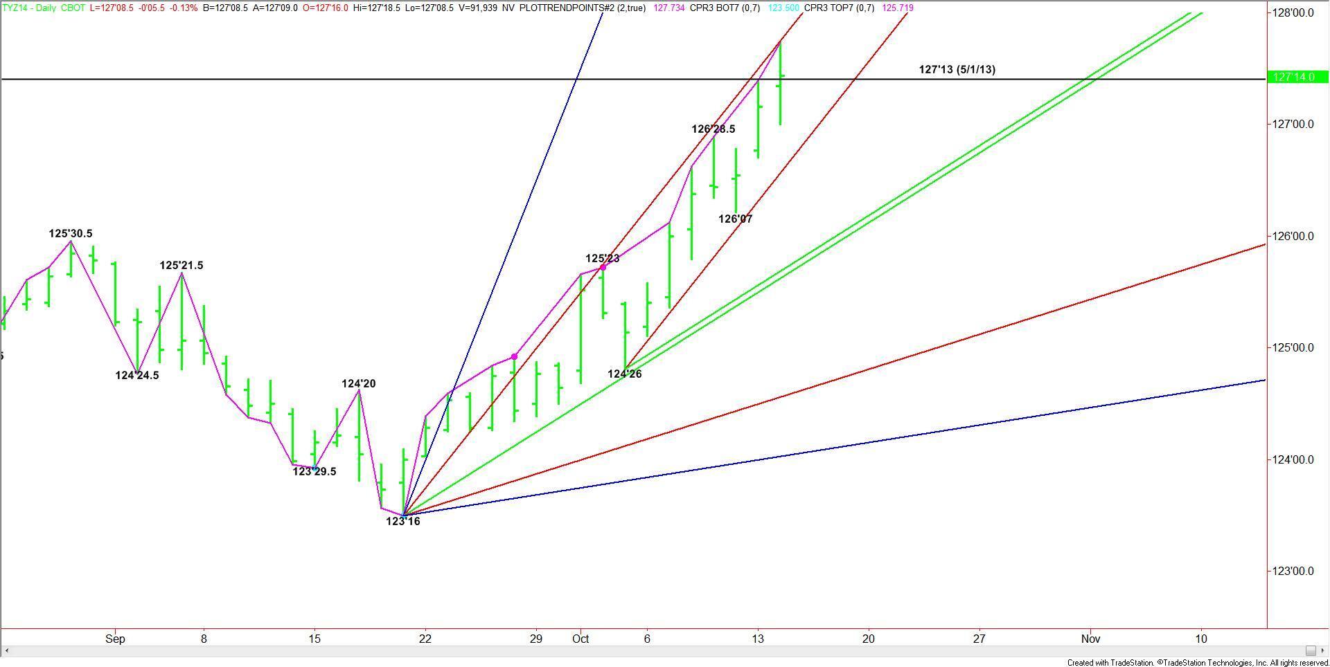 December 10-Year U.S. Treasury Notes followed through to the upside after taking out the May 1, 2013 top at 127’13, but the rally stalled when the market reached a steep uptrending angle or the upper level of the channel. The angle moves up to 128’08 today.