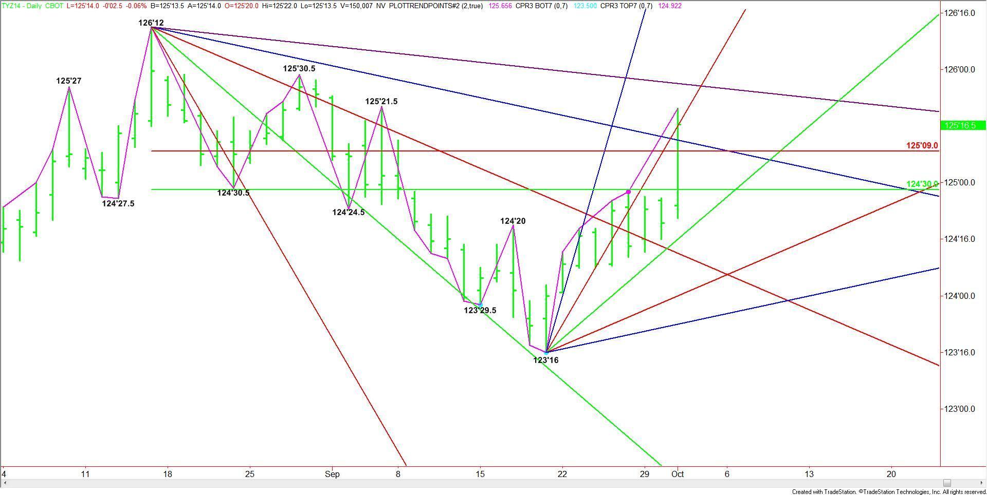 A flight-to-safety rally caused the December 10-Year U.S. Treasury Notes to surge through a key retracement zone on Wednesday. Since this move was