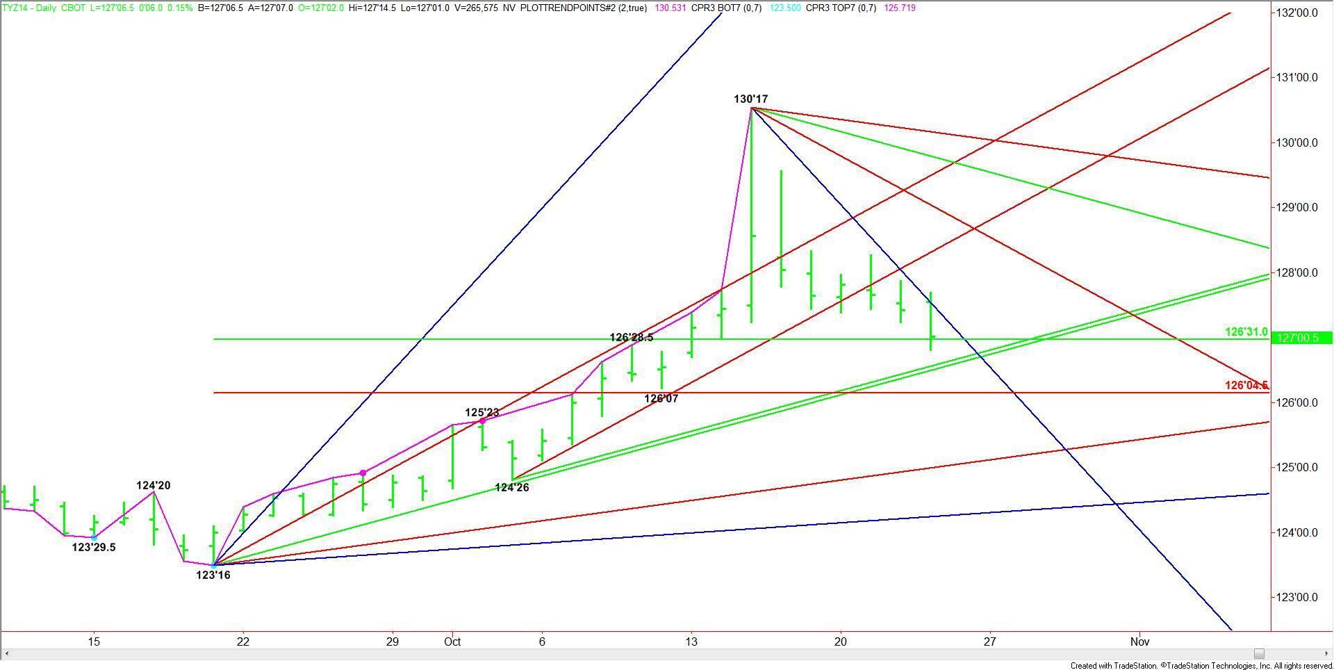 December 10-Year U.S. Treasury Bonds finished lower on Thursday after briefly touching a key 50% level. The key area to watch today is 127’01 to 126’31.
