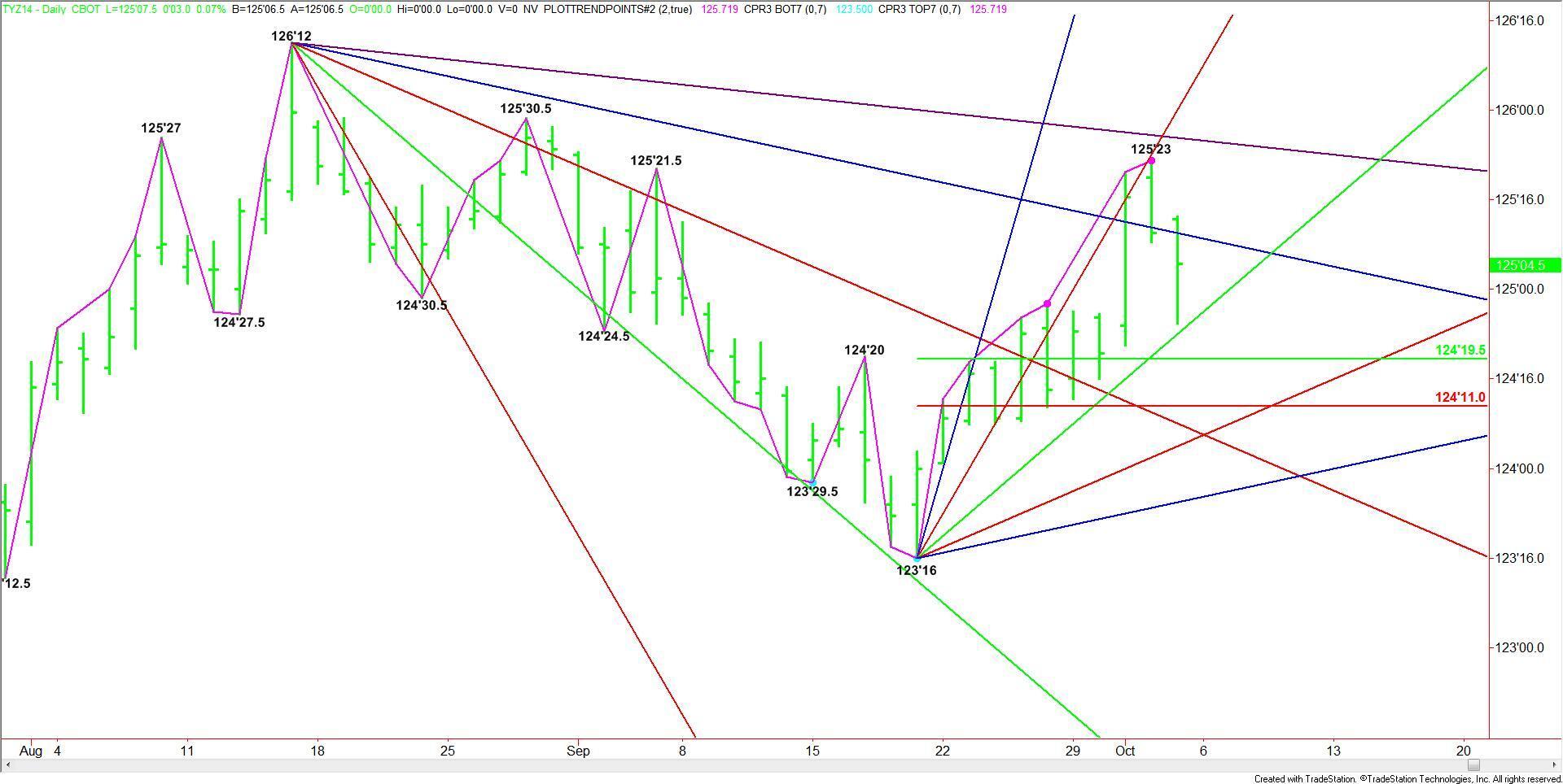 Friday’s better-than-expected U.S. Non-Farm Payrolls report should have been enough to drive this market lower into the close. However, Friday’s late session comeback suggests there may be some work to do on the upside. This may mean a test of the angle at 125’09. Trader reaction to this price should set the tone for the session.