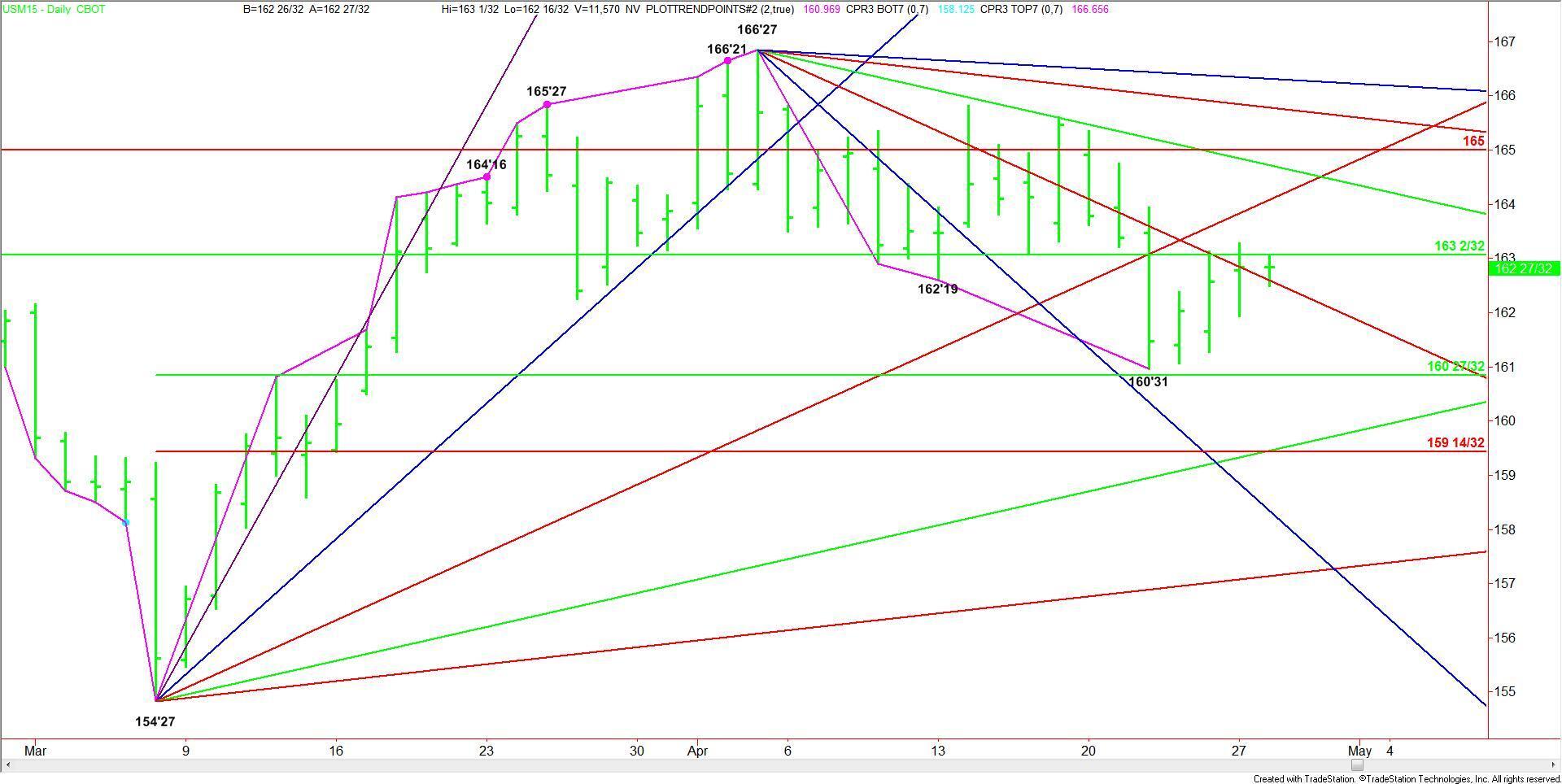 Another 50% level based on a major range is at 163’02. This price appears to be acting like a long-term pivot. This level stopped the market the last two days and is providing resistance in the pre-market session. Trader reaction to this level will set the tone for the day and perhaps the near-term.