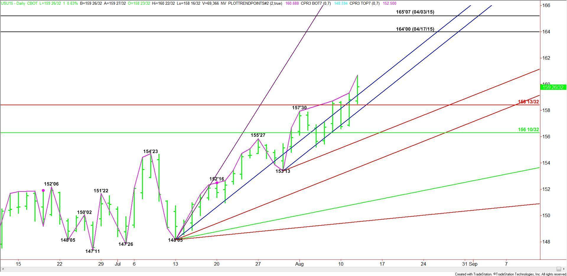 The main trend is up according to the daily swing chart. The strong rally has also put T-Bonds on the strong side of a steep uptrending angle at 159’05. A trade back below this level will not mean that the trend is getting ready to change back to down, but it will indicate that the upside momentum is slowing.