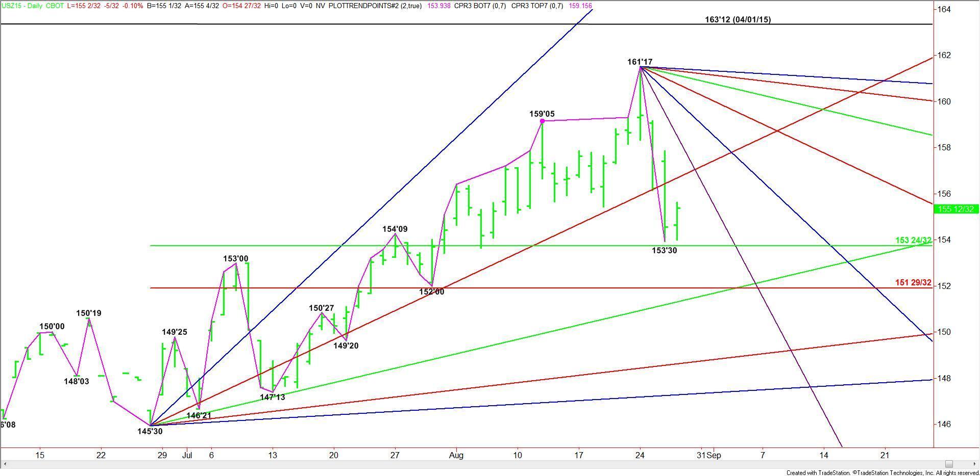 The direction of the market today is likely to be determined by trader reaction to 153’24. Continuing to hold above this level will signal the presence of buyers. Because of the steep break, there is room to the upside with the first target an uptrending angle at 156’30. This is followed by a steep downtrending angle at 157’17.