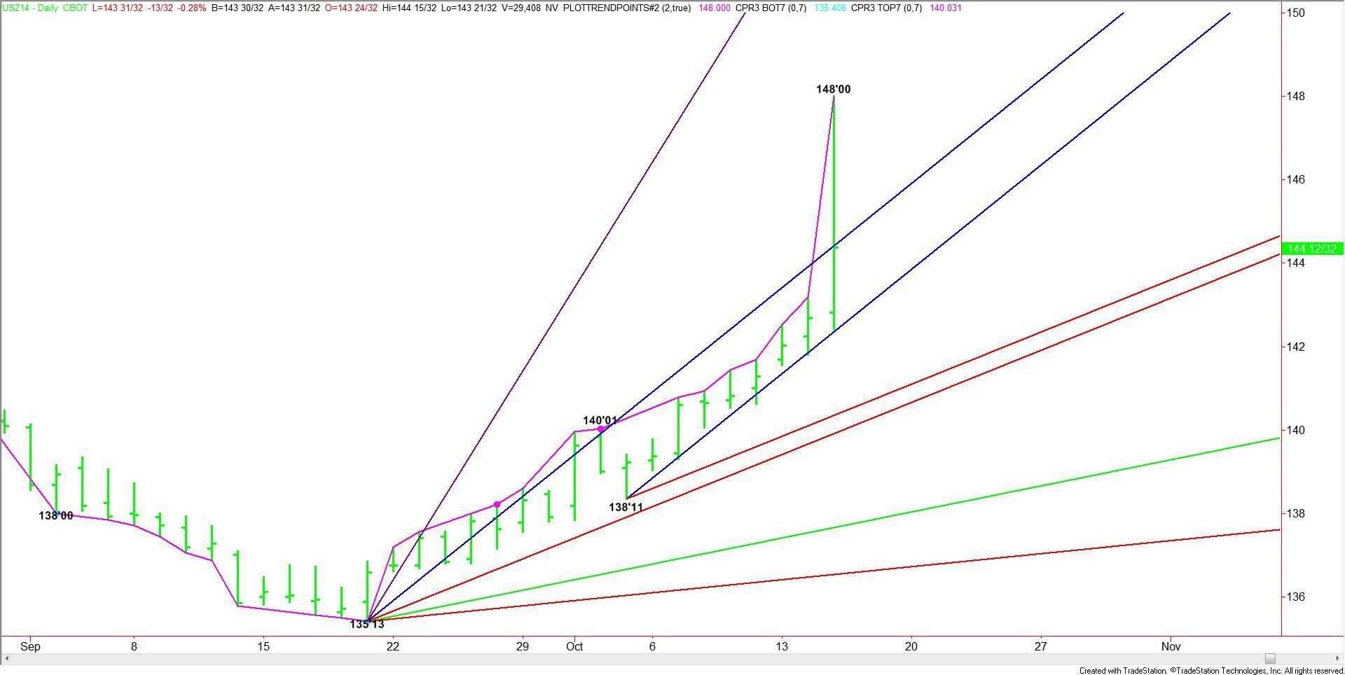 Panic buying and short-covering spiked the December 30-Year U.S. Treasury Bonds to a new all-time high on Wednesday. The move took the futures contract to 148’00, but gains couldn’t be sustained and the market settled at 144’12.