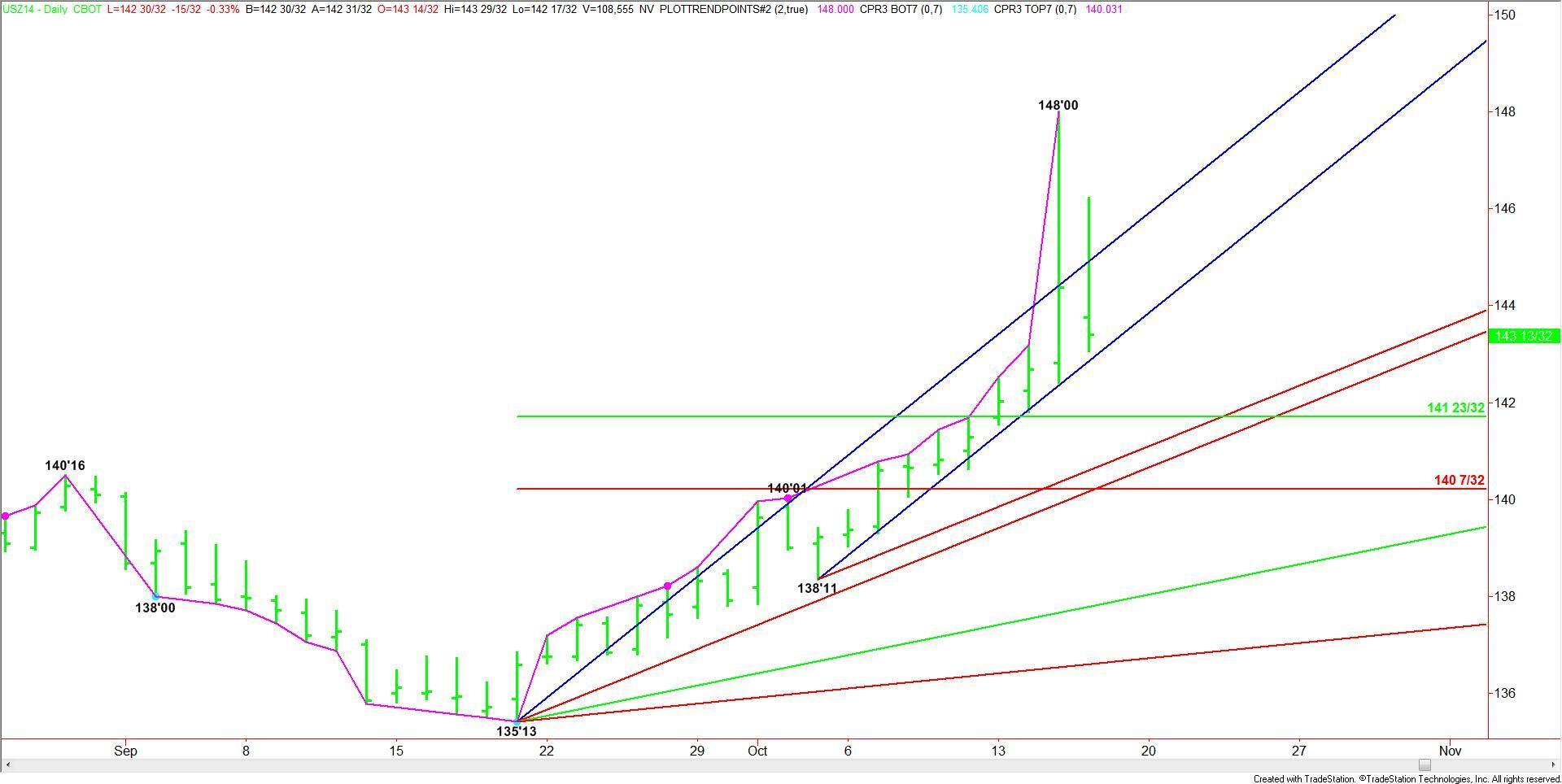 December 30-Year U.S. Treasury Bonds posted an inside day and a lower close. This gives the market a downside bias on the opening today. The market also closed inside of the up channel that has been guiding the market higher for several weeks.