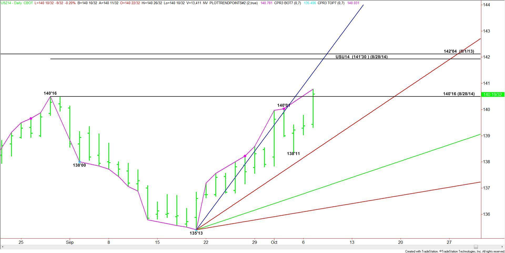 On Tuesday’s the buying surge took out the August 28 top at 140-16. If the upside momentum is strong enough then look for a drive into the possible resistance cluster formed by the steep uptrending angle at 141’29 and the September 2014 T-Bond contract high at 141’30.