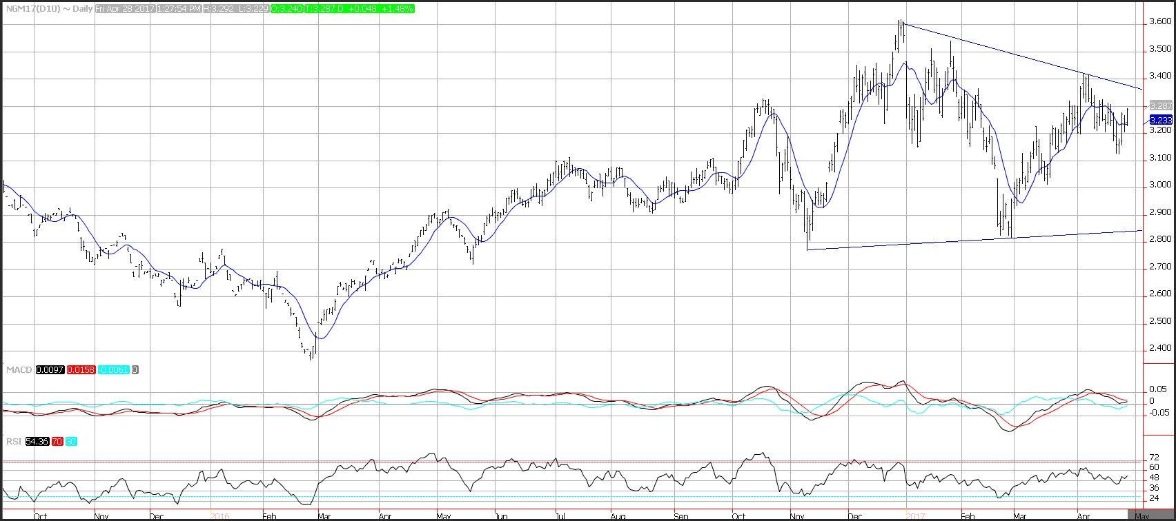 On a daily basis, natural gas continues to form the right should of a head and shoulder pattern. The neckline is seen near the 2.75 level. Support on natural gas is seen near the 10-day moving average at 3.23. Resistance on natural gas is seen near a downward sloping trend line that connects the highs in January to the highs in April and comes in near 3,38.