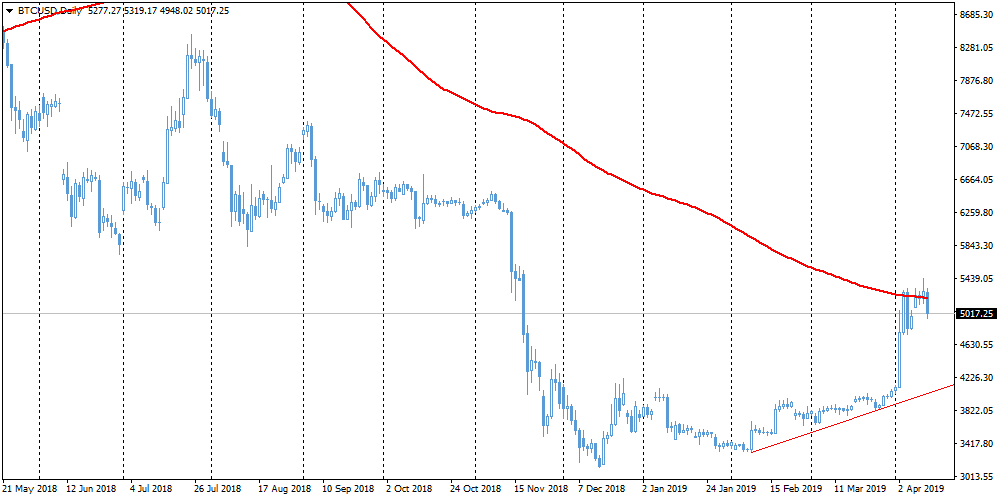 Bitcoin turned to decline. Since the beginning of the day, the first cryptocurrency lost more than 7%. Quite expectedly, the inability to develop growth and surpass resistance in the form of a 200-day moving average turned into the desire of some players to take profits from the last week rally. As a result, BTCUSD dropped to levels near 5,000, trying to catch to it as support.