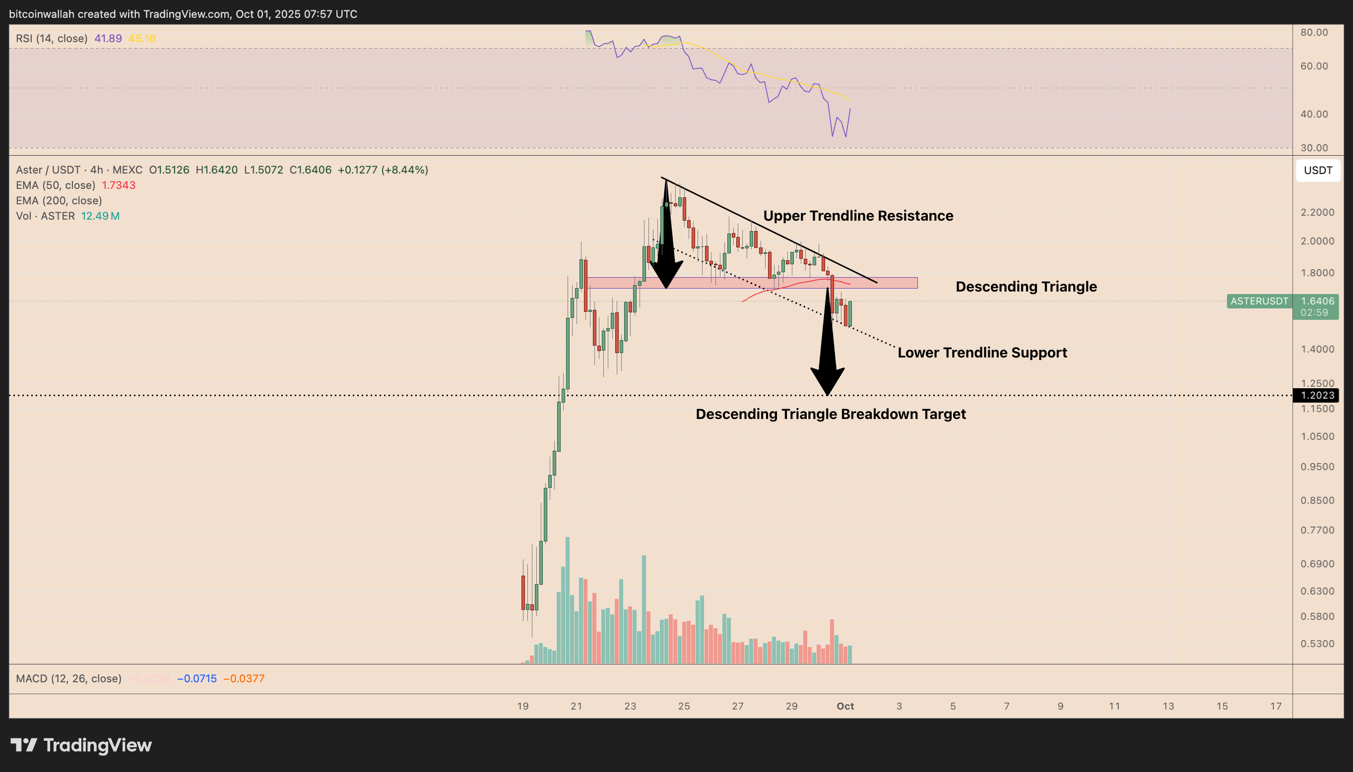 ASTER’s four-hour chart shows a breakdown below the lower trendline of a descending triangle, which is considered a bearish reversal pattern when formed after a strong rally.