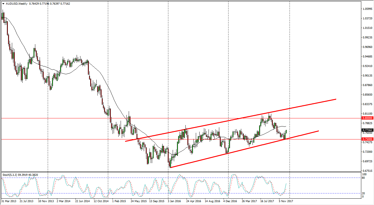 The Australian dollar has rallied a bit during the course of the week, showing signs of life again towards the bottom of a significant upward channel. I believe that the 0.75 level underneath continues to be very supportive, and the market should respect that level. I think that were going to go looking towards the 0.80 level above, which is a significant level on the longer-term charts. If we can break above the 0.80 level, the market should go to the 0.95 handle over the longer term. I think that gold needs to rally as well to shoot the Australian dollar to the upside.