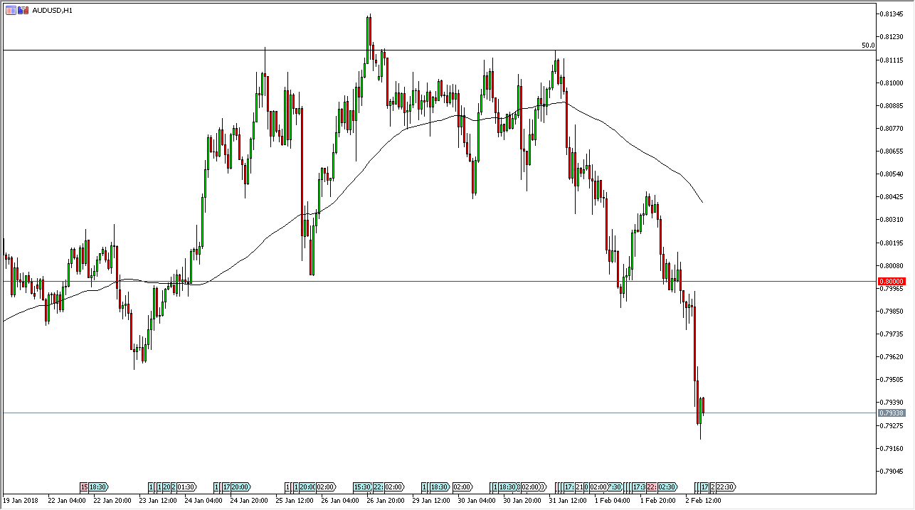 The Australian dollar fell significantly during the trading session on Friday in reaction to the strong jobs numbers coming out of the United States. By breaking below the 0.0 level, that is a psychologically damaging move, and now that we find ourselves hovering around the 0.7950 level, there could be more pain ahead.