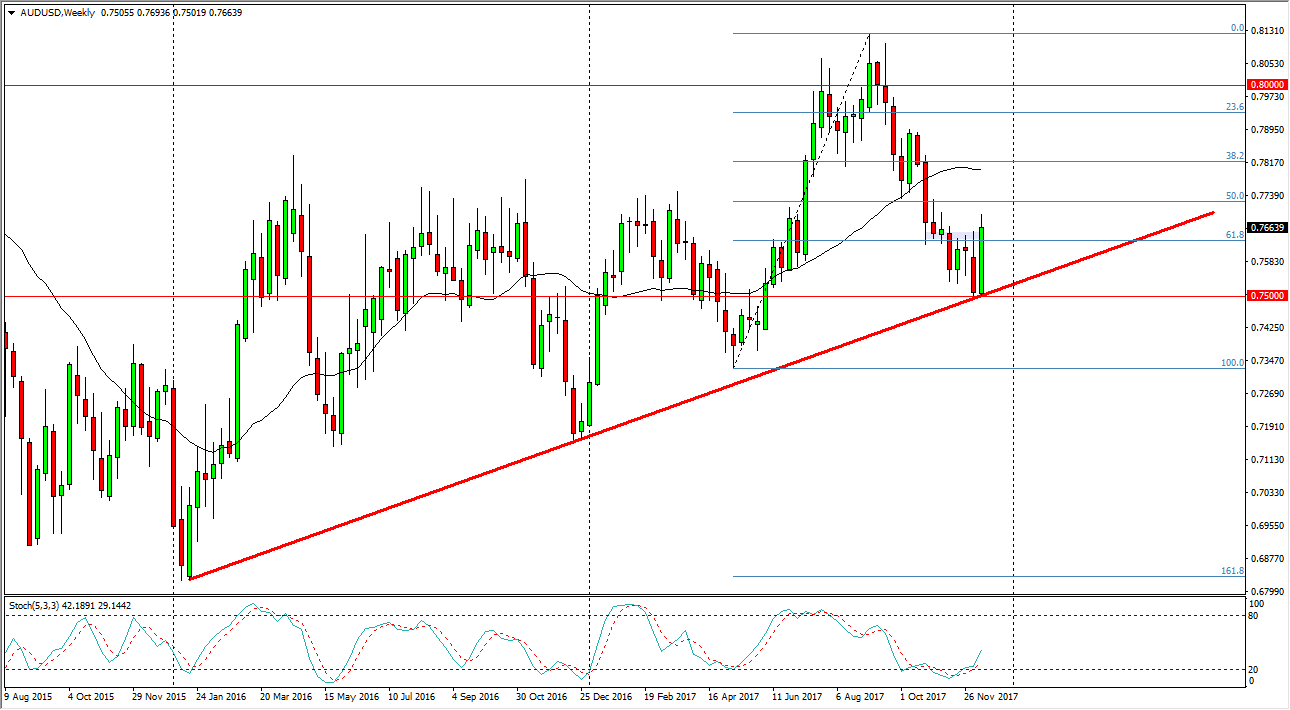 I believe that if we can stay above the uptrend line, there’s no way to short this market with any type of strength, or confidence. It will be noisy between now and the end of the year, but it looks as if the Australian dollar is continuing to look like a viable currency that will continue to go higher in value. For what it’s worth, the daily candle does look to be a shooting star, so we may get a short-term pullback, but again, if we can stay above the vital 0.75 handle, we should continue to see plenty of opportunities to start buying. A breakdown below the 0.75 handle should send this market down to the 0.68 handle of the longer-term, with several stops along the way. After this week’s candle, it looks likely that we will find plenty of buyers.