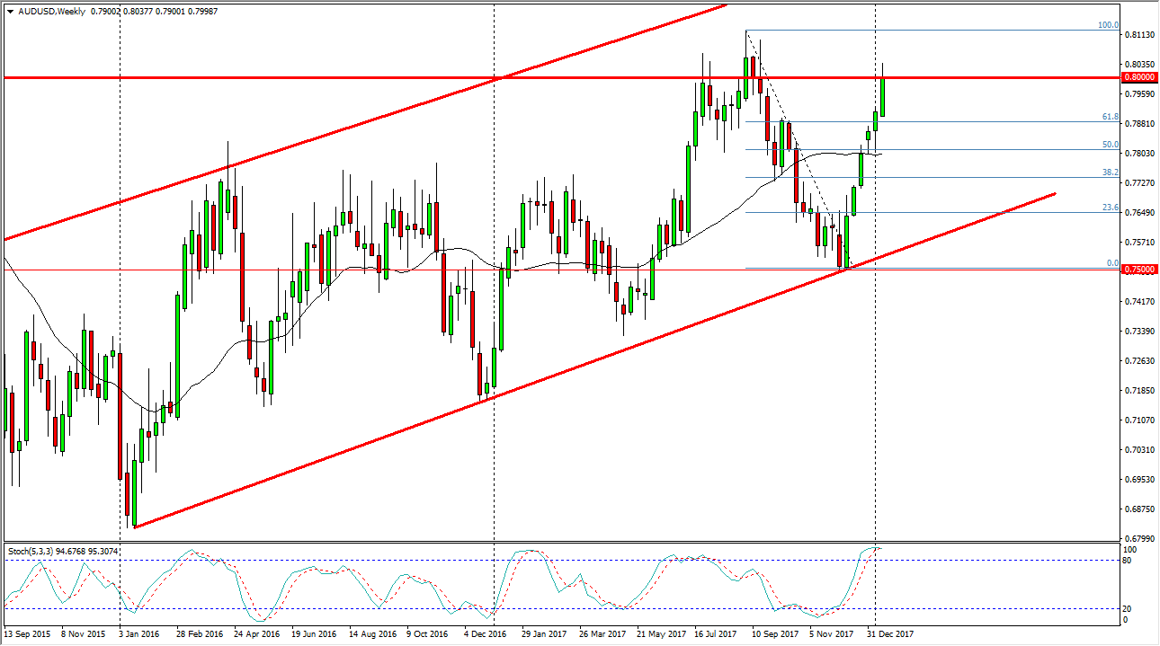 The Australian dollar rallied significantly during the week, slamming into the 0.80 level again. This is an area that goes back decades on the charts as both support and resistance. I think that the area will of course be a fulcrum for price, and when we eventually get a decision made at this level, it will lead Australian dollar trading for the next several months, if not years. It is because of this that I have been paying attention to this chart for some time.
