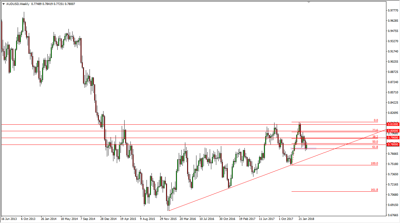 The Australian dollar has rallied nicely during the week, reaching towards the 0.7850 level. Ultimately, I think that the market will continue to rally as we have so much interest in the 61.8% Fibonacci retracement level, as per usual. The market then that could go to the 0.80 level above, which has been a fulcrum for longer-term traders going back to the late 1980s. If we can break above the 0.81 handle, then the markets free to go much higher, and I think that will eventually happen. Pay attention to the gold market, it has a major influence on the Australian dollar as well, as Australia’s the largest exporter of gold.