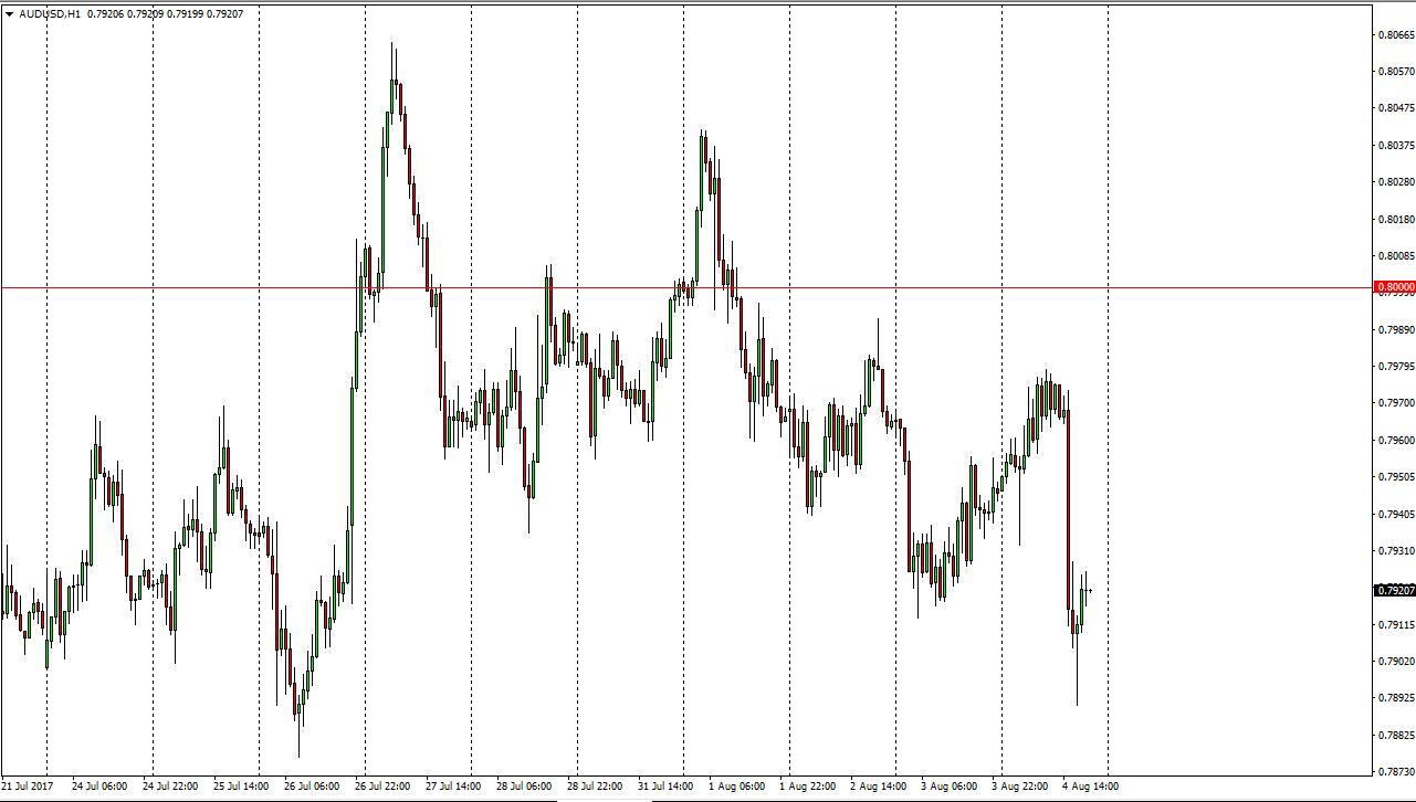 The Australian dollar started out on Friday rather bullish, but found enough resistance at the 0.7980 level to fall over. This was predicated upon the jobs number in the United States being better than anticipated, so that of course worked in favor the US dollar in the Forex world overall. It also sent gold markets much lower, so this was a bit of a “double whammy” for the Aussie dollar. When it up finding a bit of support near the 0.79 level as one would anticipate, but I think that we probably have more downward pressure to go. When you look at the longer-term charts, it certainly seems as if we are trying to roll over.