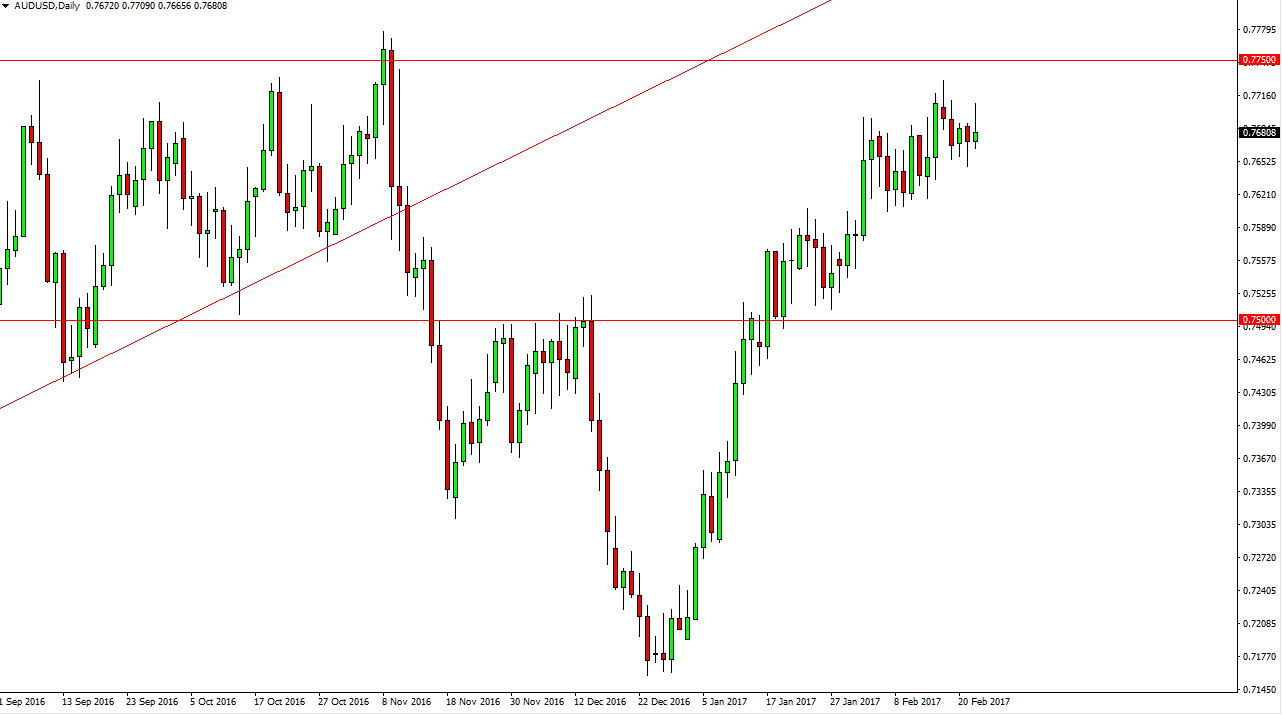 The Australian dollar rallied a bit during the day on Wednesday, but found a bit of resistance at the 0.77 handle. Nonetheless, I believe that it’s only a
