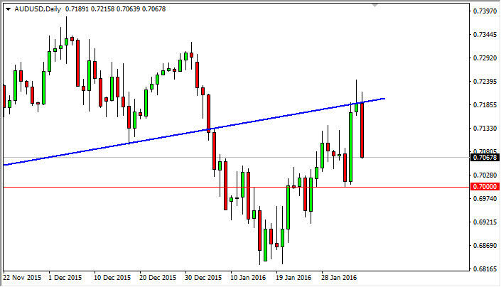 The length of the candle is pretty significant, and on the weekly chart we have a nice shooting star. As far as weekly signals are concerned, below the 0.70 level things get really interesting to the downside and quite frankly at that point we feel that this market will probably try to get down to the 0.68 handle in the end lower than that given enough time. The 0.65 level would be the next natural target, and at this point in time as long as we are below the uptrend line that previously held this market higher, we are sellers only as it means that we are still very much in the downtrend that we have been in for some time. The US dollar should continue to get a bit of a bid anyway, as there is a lot of concern out there because the global economies in general.