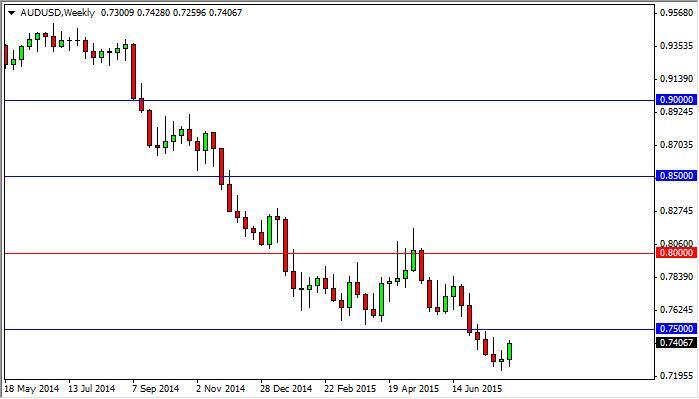 The AUD/USD pair initially tried to fall during the course of the week, but we turned back around to have a fairly bullish candle form. However, the 0.75 level above should continue to be resistance, so we are not interested in buying this market quite yet. With this, we are waiting for some type of resistive candle in order to start selling again, as the downtrend in this market is very strong. If keep in mind that commodities in general have been hurting for some time, and of course gold is very influential on this market as well. You have to look at the gold markets and recognize that there is nothing but weakness in that particular commodity at the moment, as we continue to meander around in a very tight consolidation area at lower levels.