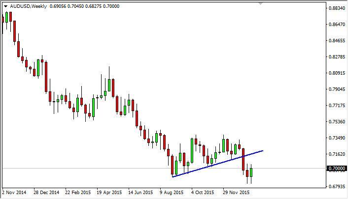 The AUD/USD pair had a slightly positive candle form during the week, as we found a bit of support near the 0.68 handle. At this point in time, breaking