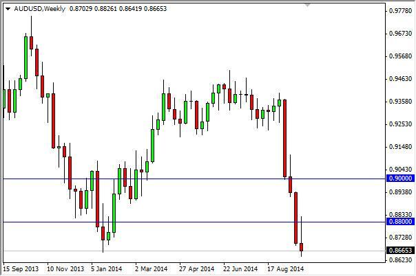 The AUD/USD pair initially rallied during the course of the week, slamming into the 0.88 handle. That level of course is massively resistive, and as a result we feel that the sellers will continue to step into this marketplace every time we rally. After all, the gold markets have been absolutely brutalize lately, and have broken down below the $1200 level, which is a sell signal for the longer-term charts as well. We believe that the gold markets are heading down to the $1000 handle, and that should translate into a much lower valued Australian dollar.