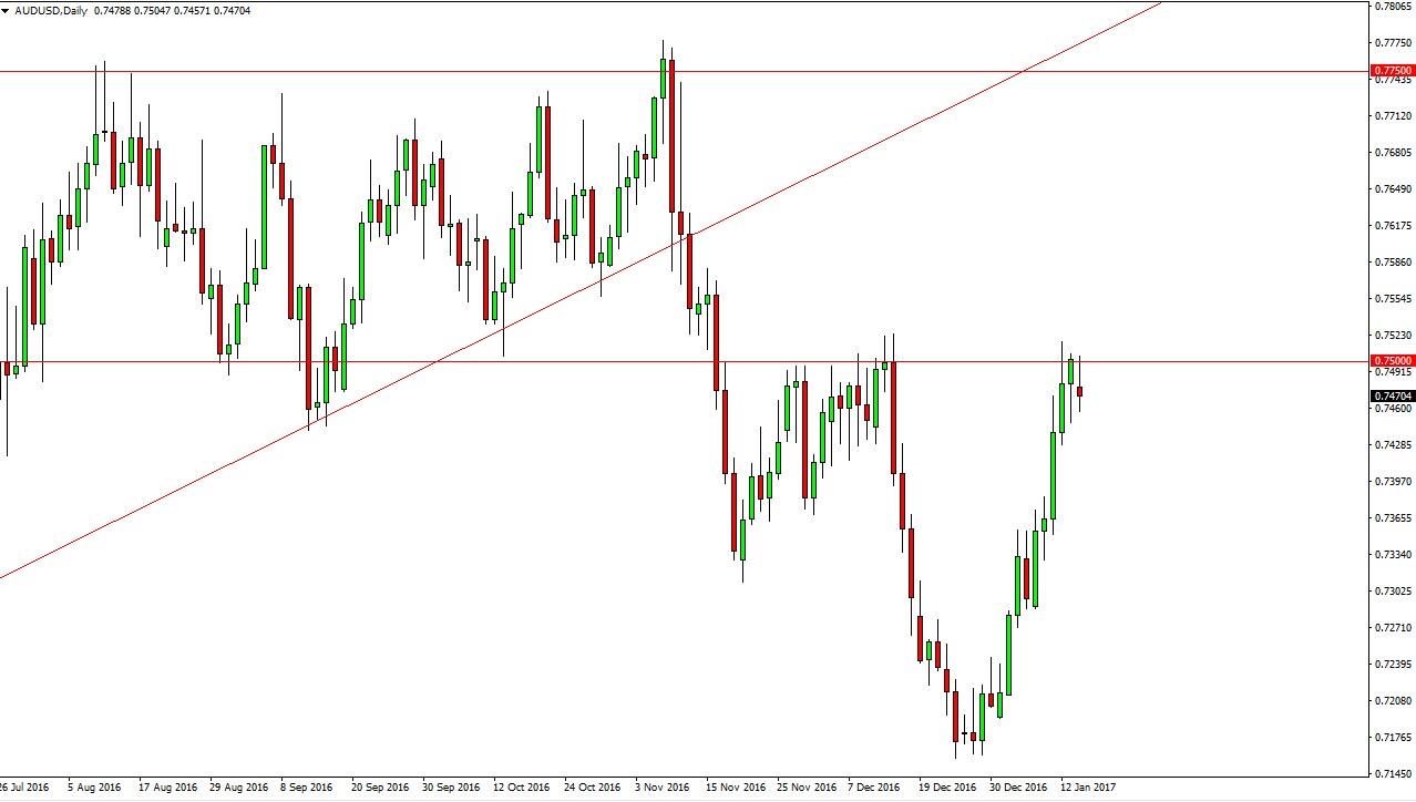 The AUD/USD pair had a volatile session on Monday, reaching towards the 0.75 level above. This is an area that is resistive, and until we can break above
