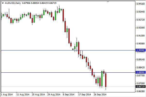 The AUD/USD pair fell hard during the course of the day on Friday, testing the 0.8650 level. That level opens the door to fall the way down to the 0.85 level, and we think that in fact will happen. Rallies between now and then will be selling opportunities as we believe the 0.88 level will be resistance. Even if we get above the 0.88 level, is not until we get above the 0.9050 level that we are comfortable buying. The gold markets falling so drastically certainly haven’t done anything to help the value of the Australian dollar.