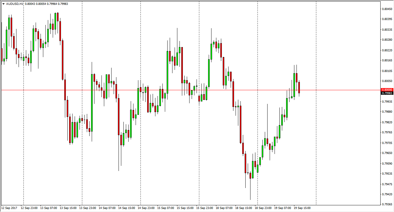The Australian dollar exploded to the upside during the day on Tuesday, breaking above the 0.80 level at one point. We turned around though, and I think that this level will continue to offer a significant amount of resistance until we get clarity out of the Federal Reserve. There are a lot of conflicting ideas as to what the central bank will be willing to do, especially after the hurricane damage in the southeastern part of the United States. My suspicion is that the Federal Reserve will be reluctant to raise interest rates in what could be a difficult time for the US economy, as the damage assessment is still being looked at. Beyond that, there is yet another hurricane coming, which is at the very least going to affect the US Virgin Islands and Puerto Rico. With that in mind, I believe that the federal reserve will become dovish, or at least stand still.
