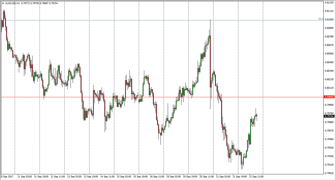 The Australian dollar shot higher during the day on Friday, reaching towards the 0.7975 level. We have seen a significant amount of noise recently, and it now looks as if the gold markets may be trying to find some type of floor. If they do, I think that the Australian dollar will eventually break above the 0.80 level. Ultimately, I think that the pair will go much higher than that, but I recognize it will take a certain amount of work. If we can break above the 0.81 handle, the market will be free to go much higher. Ultimately, I think that the market should continue to move back and forth due to risk appetite in Asia, and of course the value of the US dollar on the whole. Given enough time, I think that we will continue to see buyers on these dips.
