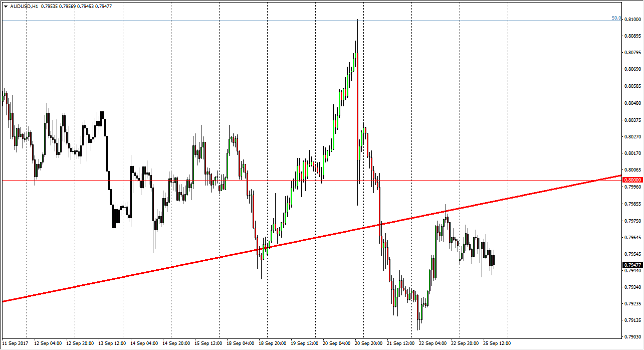The Australian dollar fell a bit during the day on Monday, but continues to find plenty of noise in this general vicinity. I think that we are going to see a lot of choppiness, and that the 0.80 level above will continue to be very important. I think if we can break above that level, then the market goes much higher. After all, that would be one of several breaks above that psychologically important level, and that of course is a very healthy sign. Gold markets course have an influence on the Aussie dollars well, but right now they been a bit cool. I think that the market has plenty of support near the 0.79 level as well, and although we may have a proclivity to roll over slightly, I think that the volatility is only going to get worse, not better.