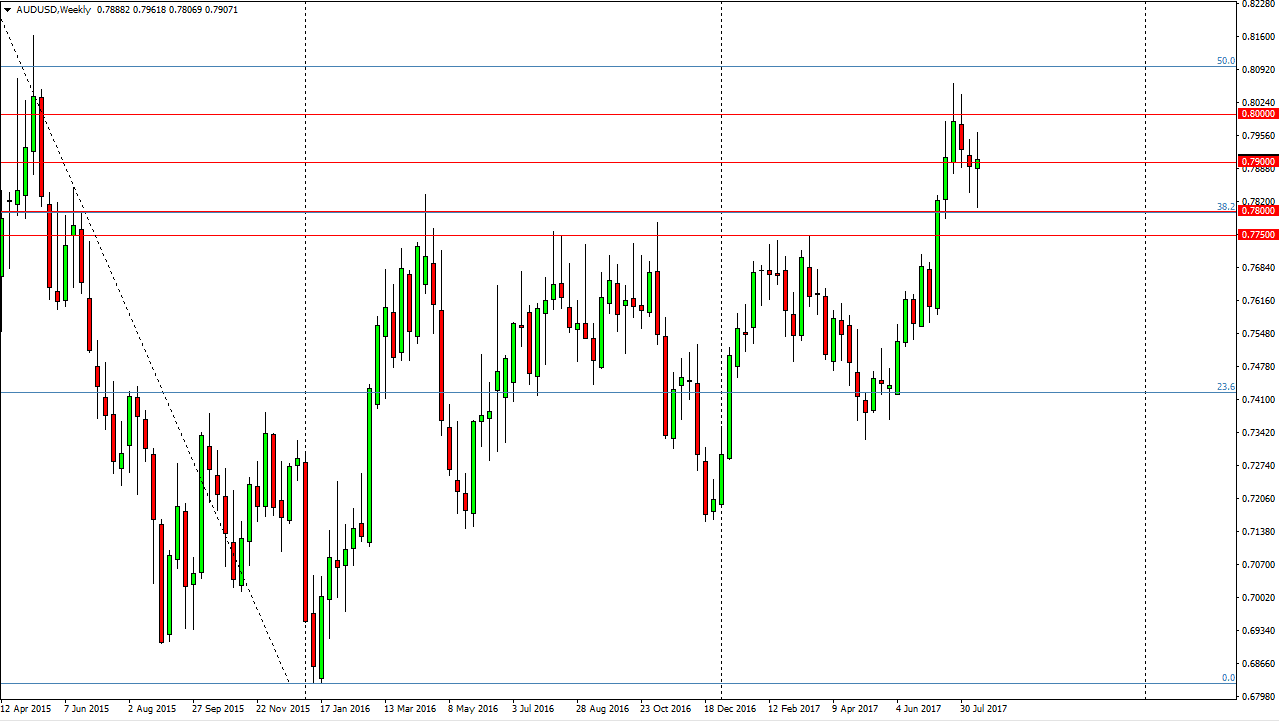 The Australian dollar went back and forth during the week, ultimately settling on a neutral looking candle. Because of this, I think we have tested the 0.78 level for support, and I think that the buyers will probably return. It’s not until we break down below the 0.7750 level that I would consider selling, and the weakness in the US dollar should continue to propel this market higher. However, I’m the first person to admit that the 0.80 level above will continue to be very difficult to break above as it is important on charts going back decades. Nonetheless, I think that the gold markets could give us reason enough to rally as well, especially if they break above the $1300 level. The market is an anti-US dollar mood overall, and I think the Australian dollar will of course benefit from that.