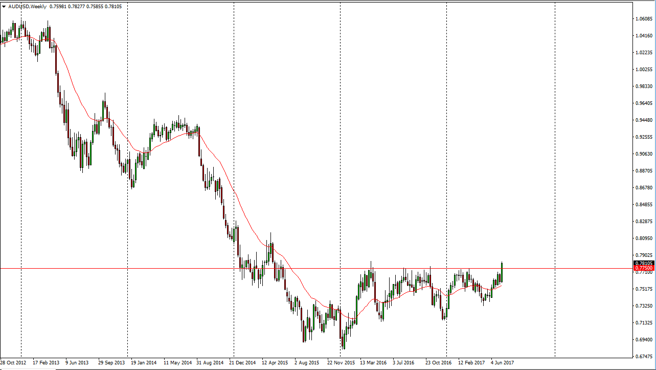 The Australian dollar broke out during the week, slicing above the 0.7750 level. The market looks very bullish, but there is a bit of a “zone” above that