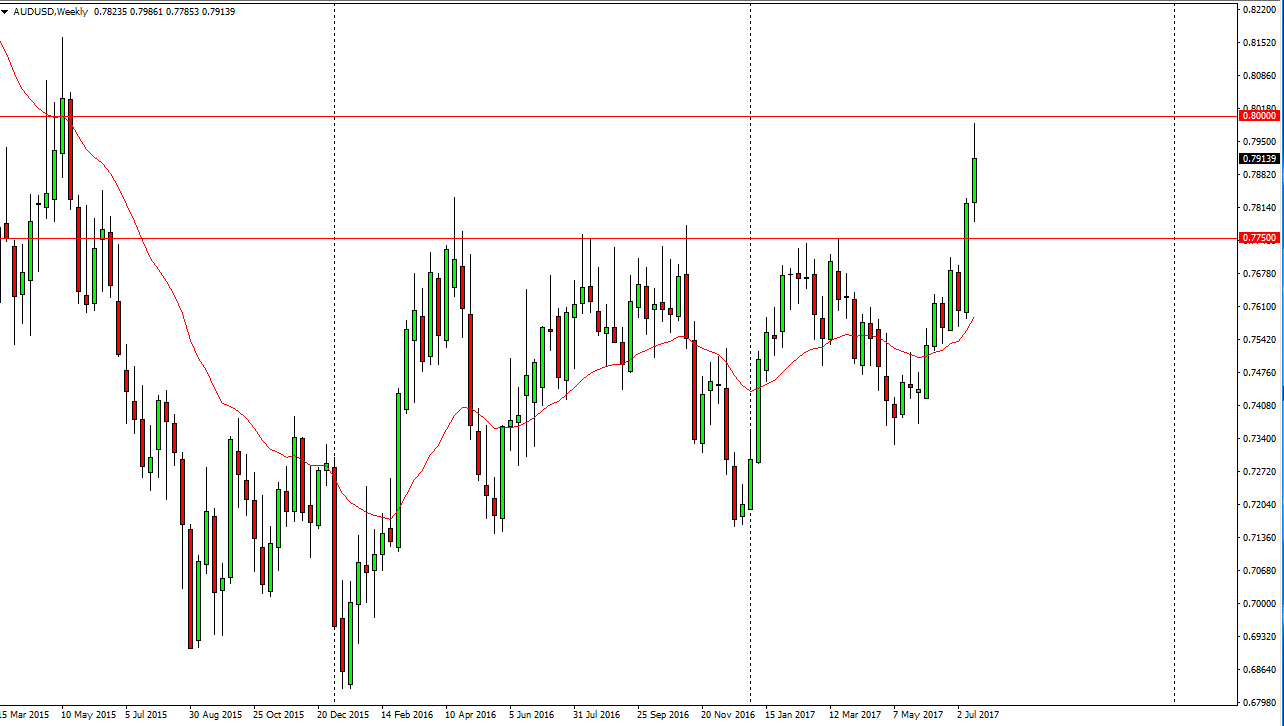 The Australian dollar had an explosive week during the past several sessions, slamming into the 0.80 level. However, that area continues to be resistive,