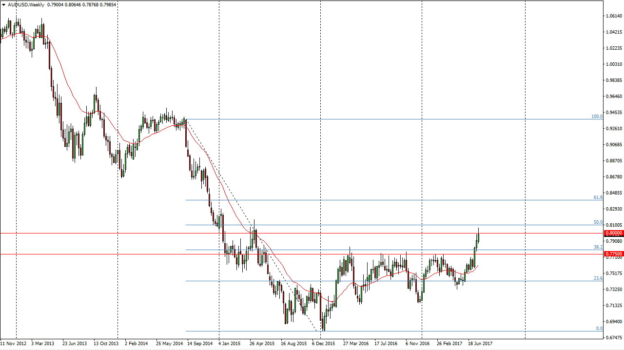 The AUD/USD pair rallied during the week, slicing through the 0.80 level. However, we did run into a bit of resistance there, as one would expect. After