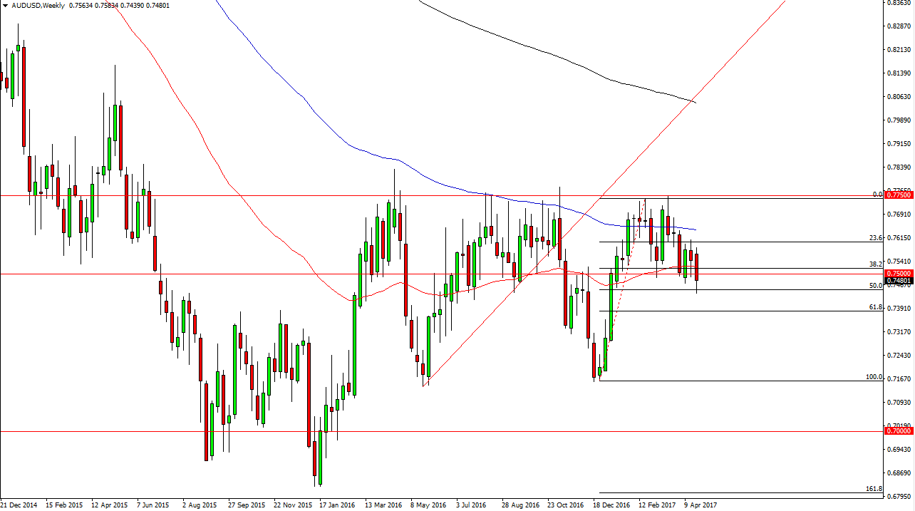 The AUD/USD pair fell significantly during the week, reaching down to the 50% Fibonacci retracement level. If we can break down below the bottom of the
