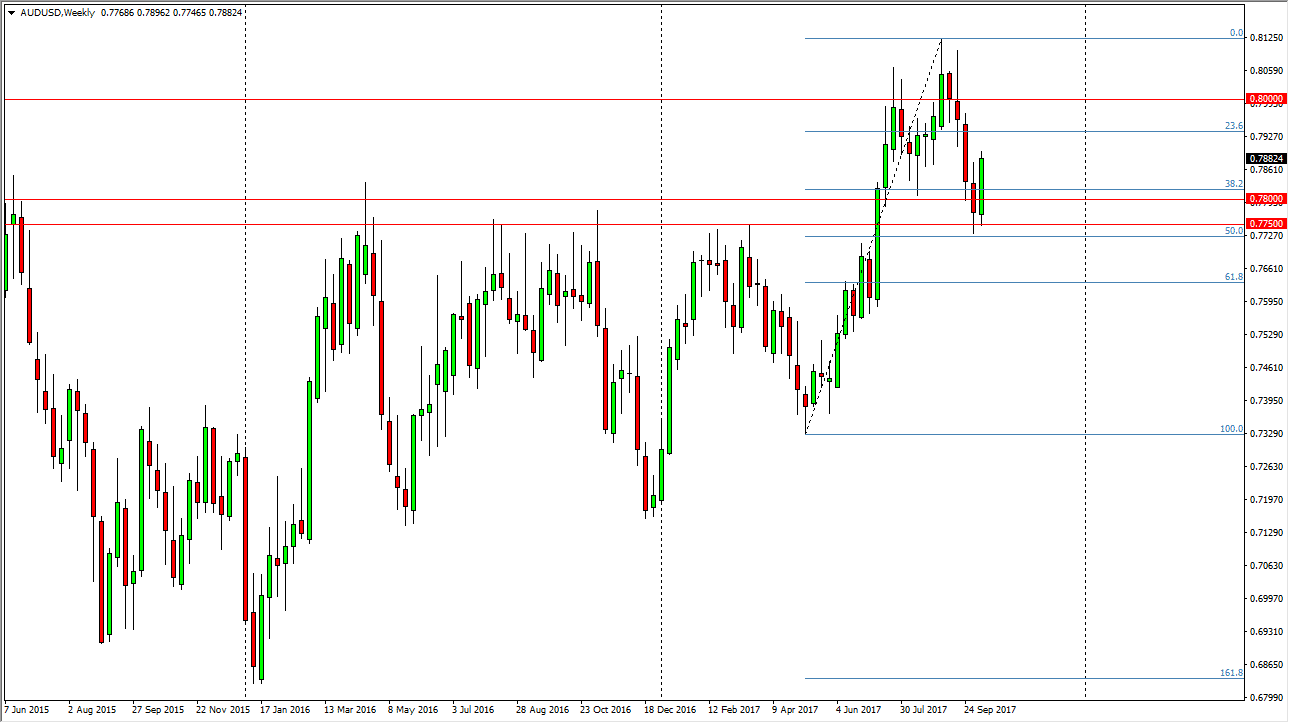 The AUD/USD pair rallied during the week, showing signs of support near the 0.77 handle. As you can see, we had recently broken out above an ascending