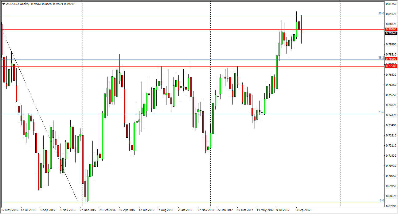 The Australian dollar had a volatile week during the past 5 sessions, reaching as high as the 0.81 handle, and dipping as low as the 0.79 level. We continue to dance around the 0.80 level, an area that is important on charts going back several decades. It’s not surprising that we would continue to see choppiness in this area, because quite frankly this dictates where we go for the next several months. I believe that the 0.78 level below begins a significant amount of support that extends down to at least the 0.7750 level, as that region was the resistance that we broke out of recently. I still think that the buyers will continue to take over, especially considering if the gold markets rally, which look ready to happen. If gold breaks above the $1300 level, I believe that eventually money will go flowing into the Aussie dollar.