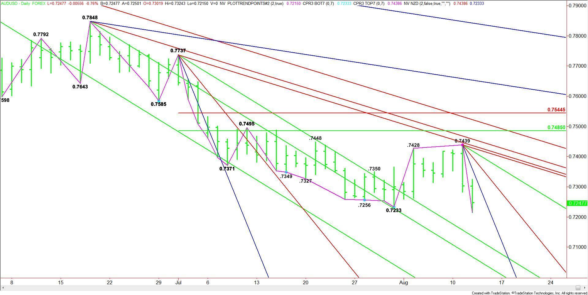 The sell-off earlier in the session drove the market through the late July main bottom at .7233, stopping at .7215 before regaining the previous bottom. This suggests that the move through the bottom may have been related to sell stops rather than fresh shorting. Based on the current price at .7250, anyone that sold weakness through .7233 is trapped. This could lead to further short-covering until a stopper comes in to refresh their short positions.