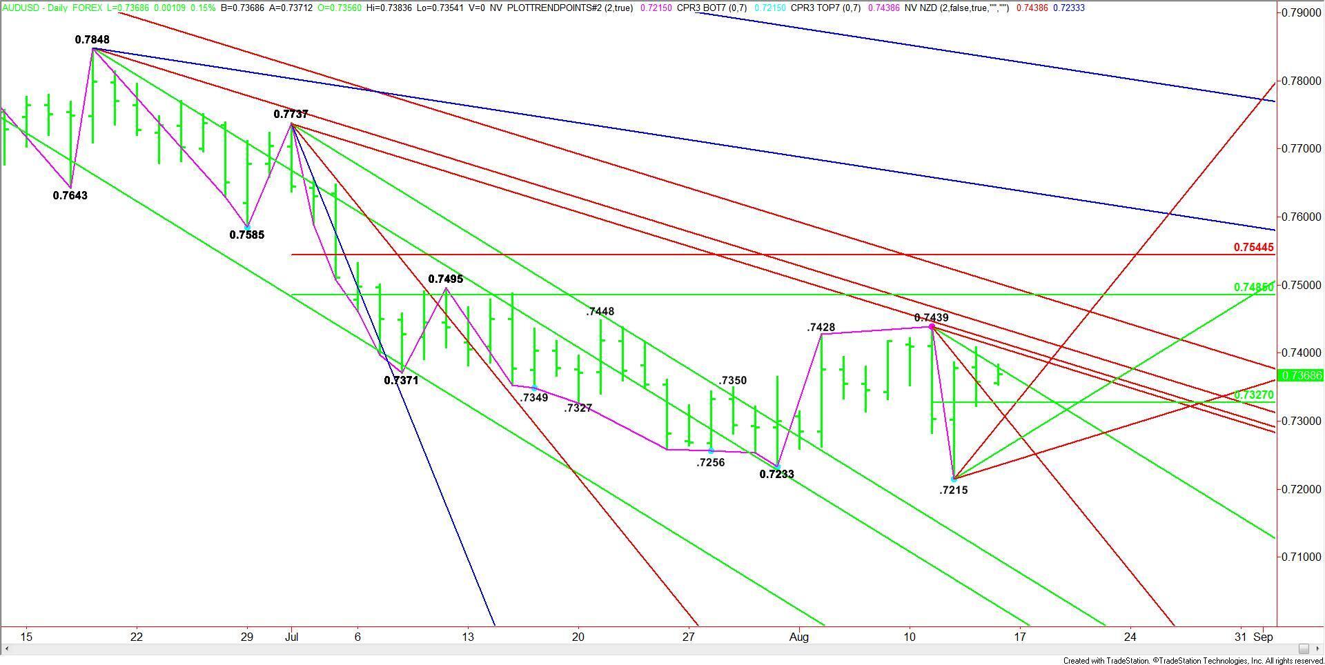 The short-term range is .7439 to .7215. Its 50% or pivot level is .7327. This angle is controlling the short-term direction of the market. Continuing to hold above this level will signal the presence of buyers.