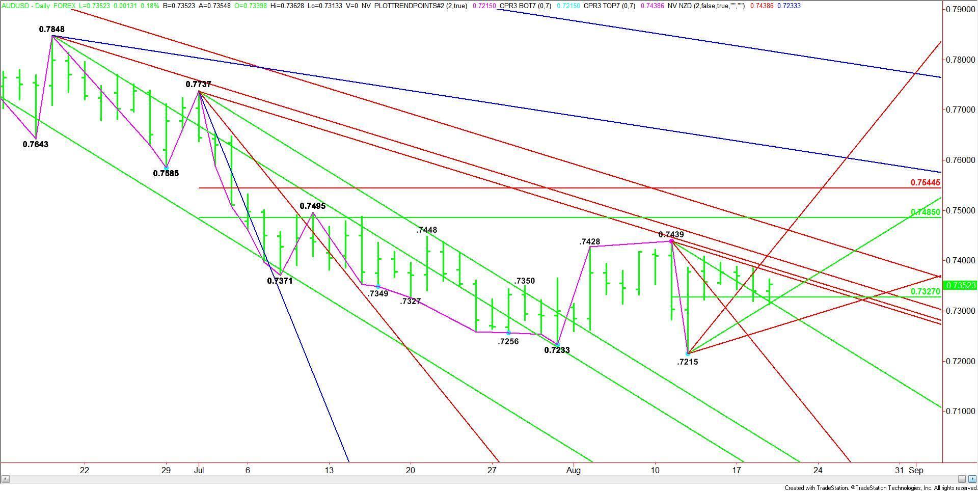 The main trend is down on the daily swing chart. The short-term range is .7439 to .7215. Its mid-point or pivot is .7327. This pivot is controlling the short-term direction of the market.