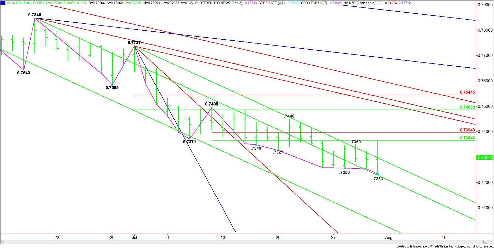 The direction of the market today will be determined by trader reaction to the downtrending angle at .7277.