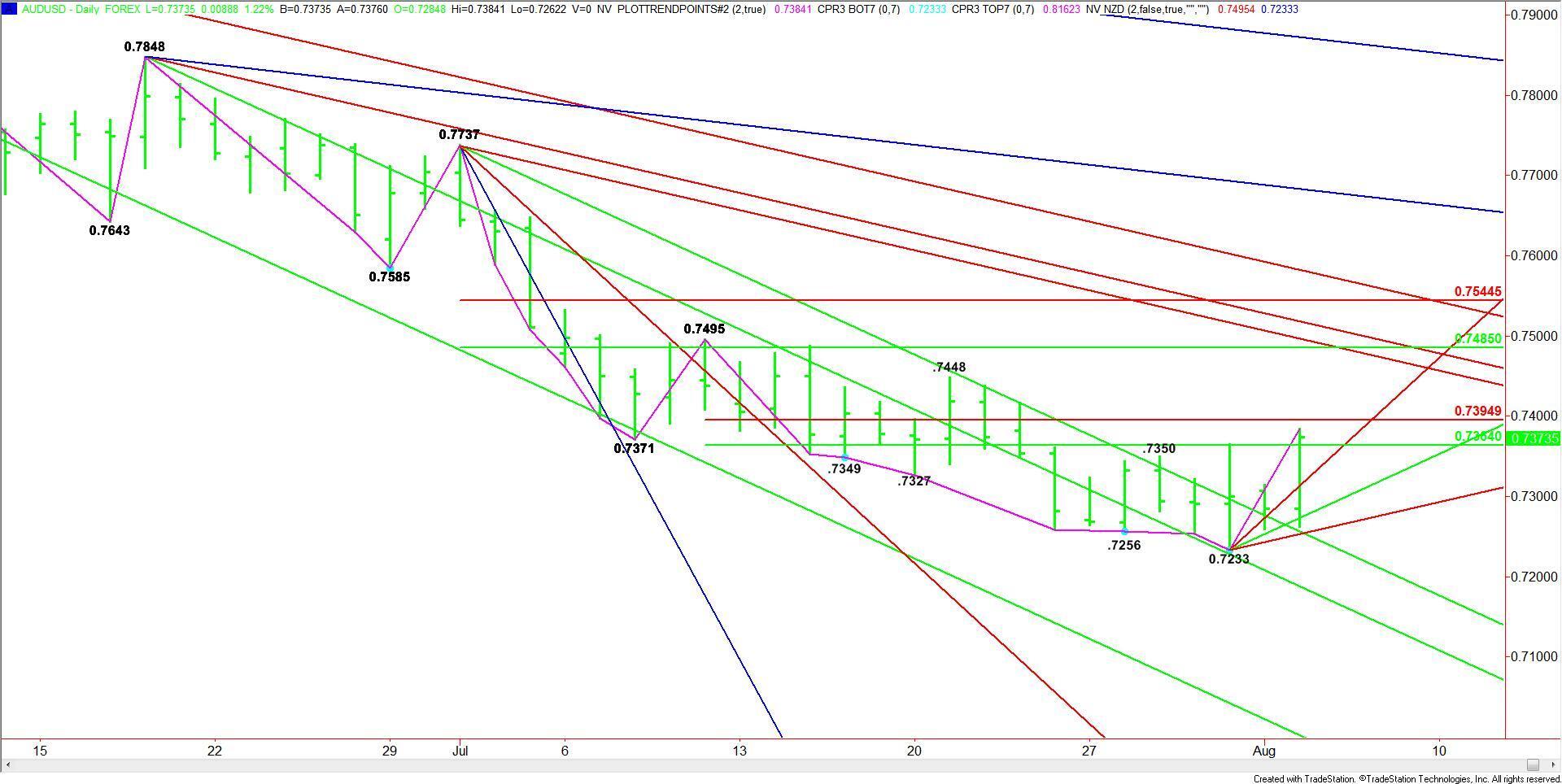 A sustained move over .7364 set up the market for a rally into the Fibonacci level at .7395. The daily chart opens up to the upside over this level with potential targets at .7485, .7495 and .7497.