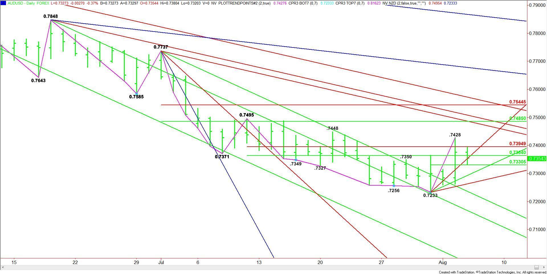 A sustained move through .7330 is likely to trigger a break into the next uptrending angle at .7313. The next angle comes in at .7273. This is the last major uptrending angle before the .7233 main bottom.
