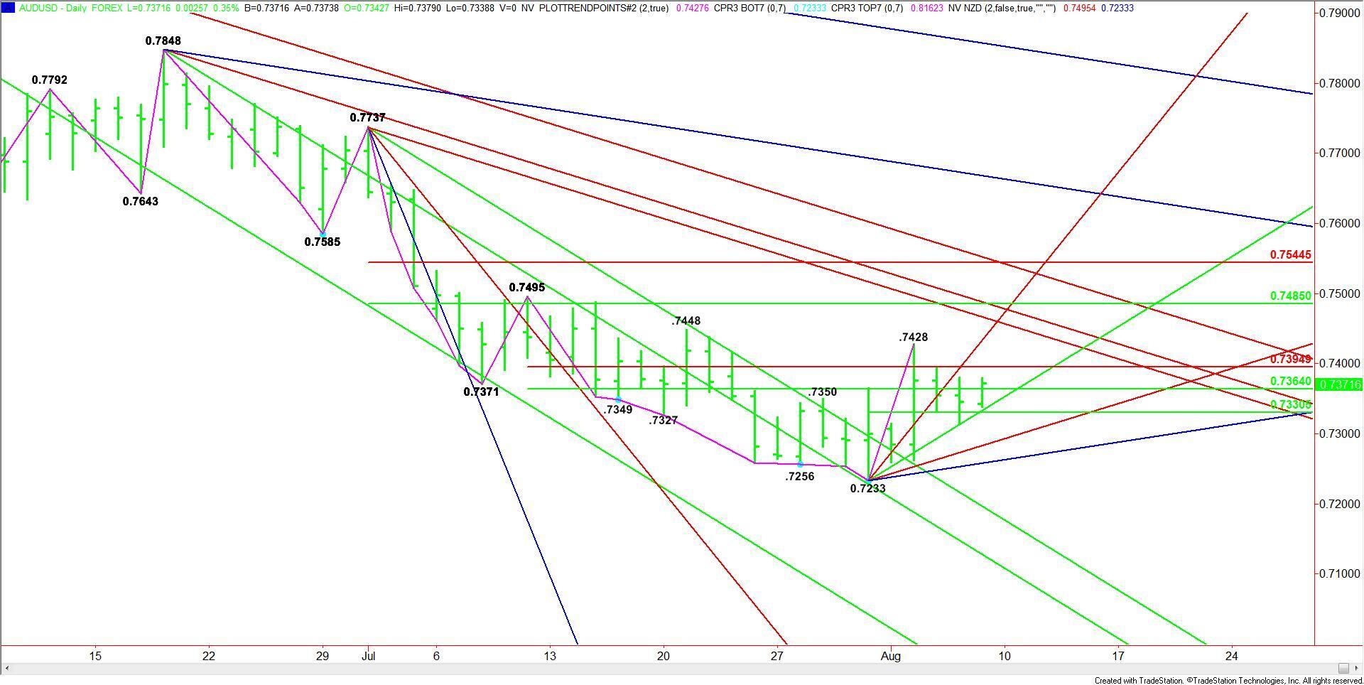 The short-term range is .7233 to .7428. Its 50% level or pivot is .7330. This price is controlling the short-term direction of the market. A trade below it will give the market a downside bias with the first target an uptrending angle at .7283. This is followed by another angle at .7258. This is the last support angle before the .7233 main bottom.