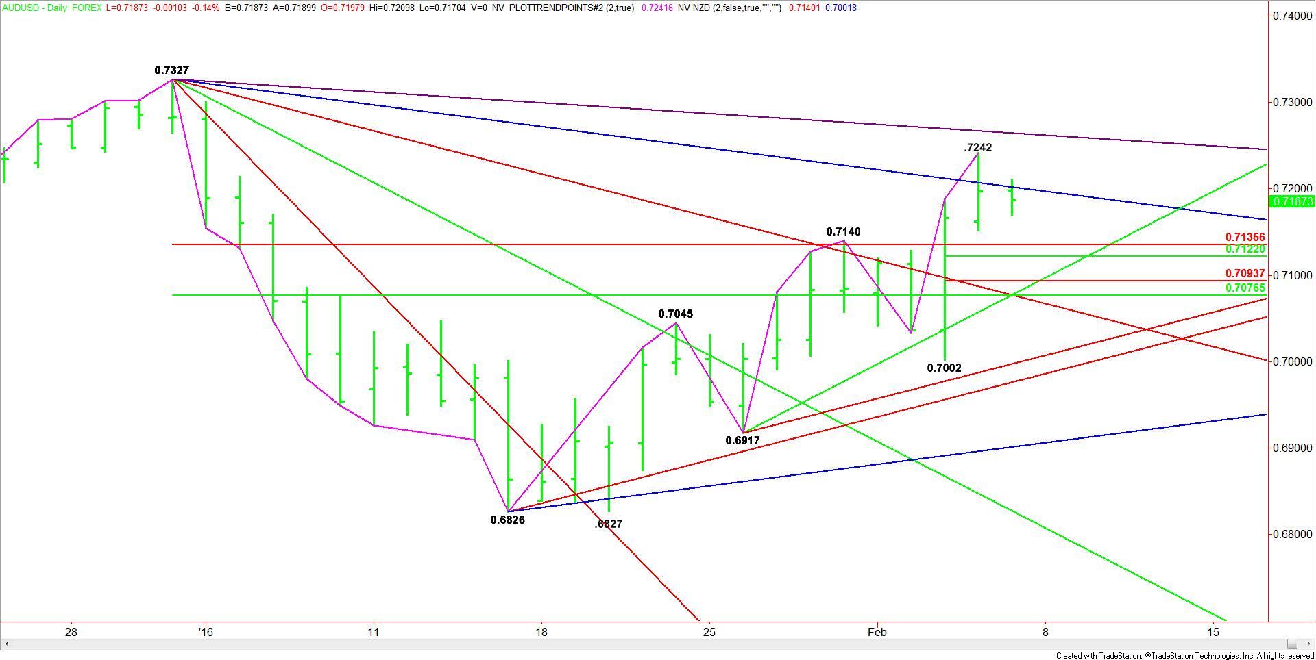 The current rally stalled on Thursday at .7242, creating a minor range with the main bottom at .7002. Its retracement zone at .7122 to .7094 falls inside the main retracement zone, making it a valid downside target.